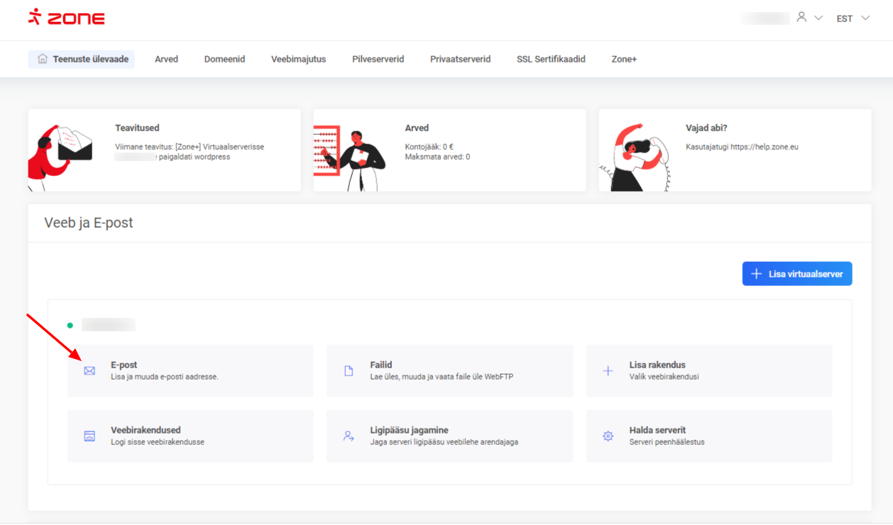 E-posti konto lisamiseks tuleb esmalt sisse logida teenuste halduskeskkonda Minu Zone ja teenuste ülevaatelehel valida Veeb ja E-post jaotisest E-post.