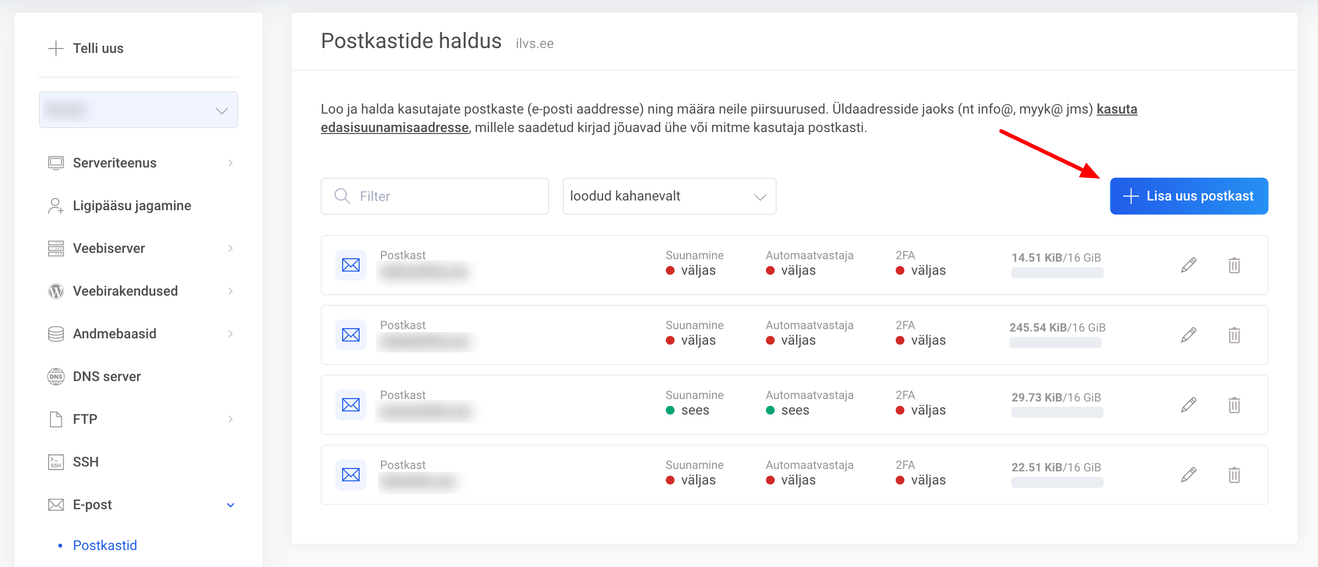 E-post alt vali Postkastid ja uue postkasti lisamiseks vajuta Lisa.