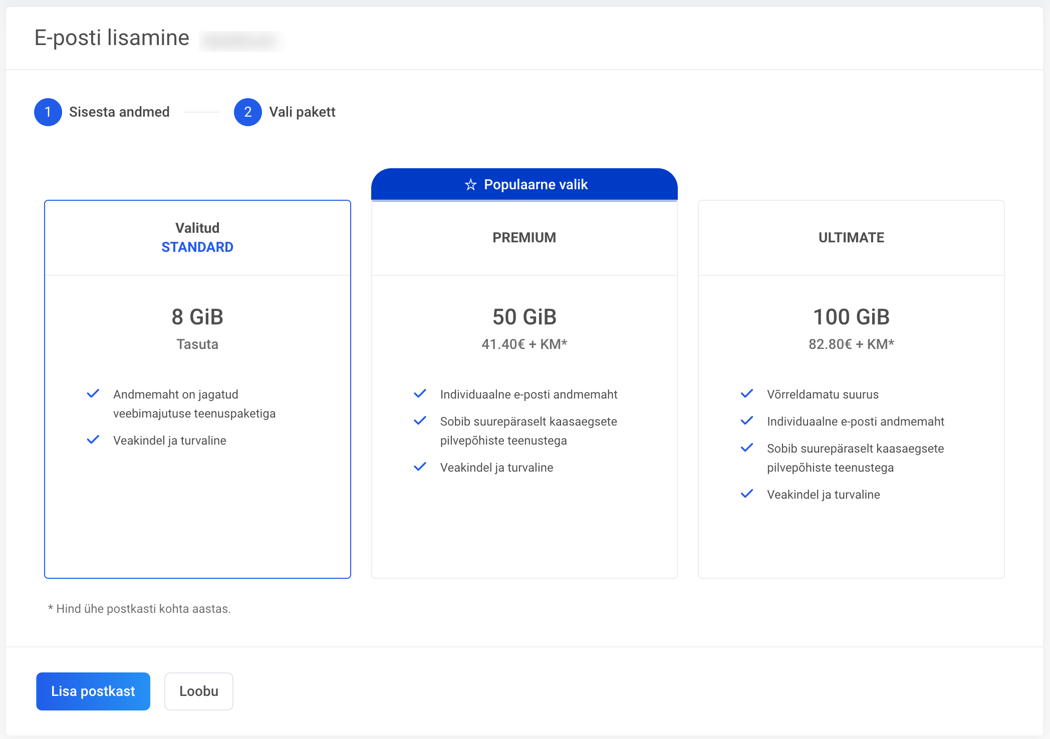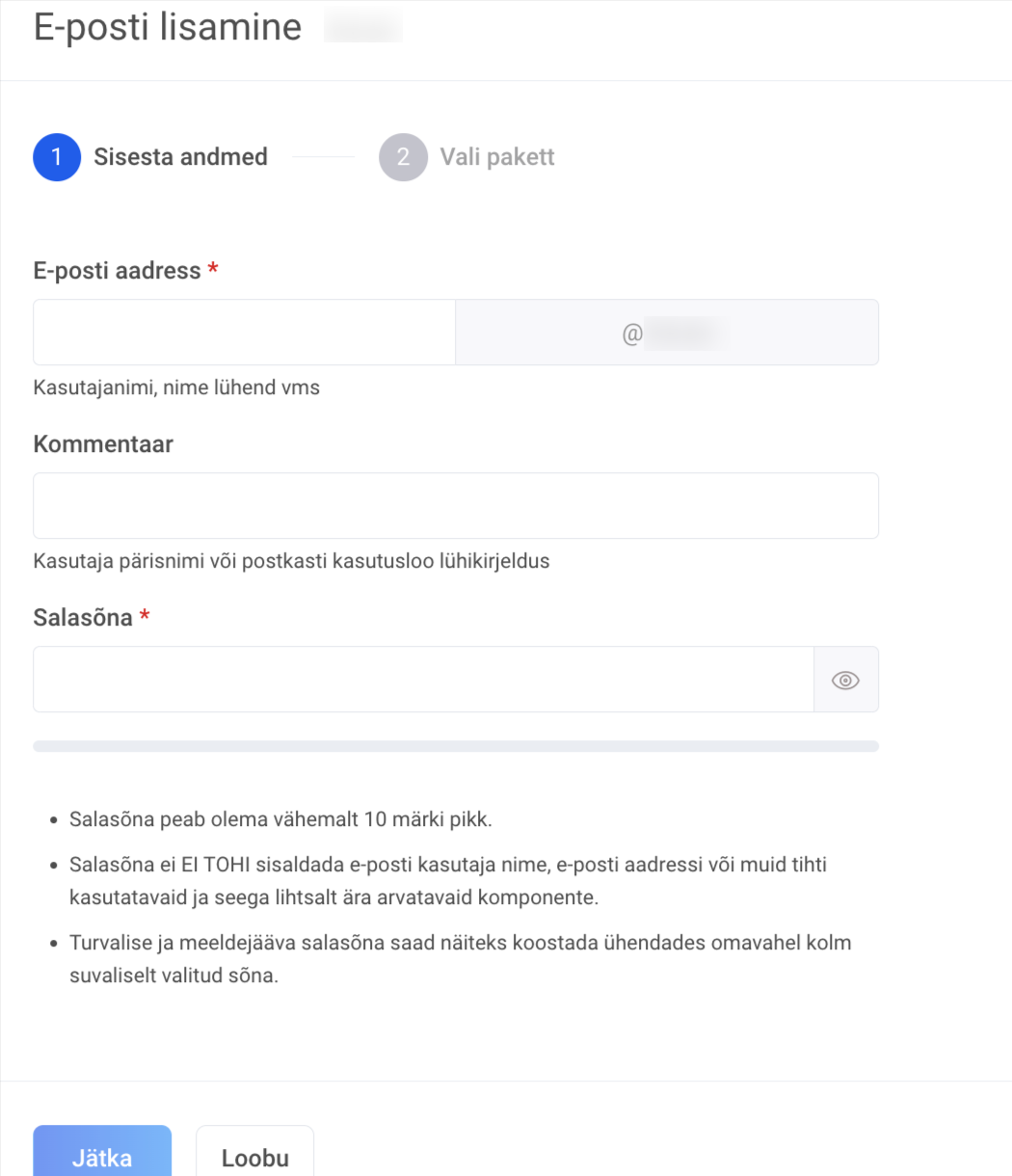 Uue postkasti lisamiseks on vaja täita tärniga lahtrid E-posti aadress ja Salasõna. Kommentaari lahter on valikuline – see on visuaalne abivahend postkastide eristamiseks puhkudel kui aadresse on serveris palju, seda infot mujal ei näidata.