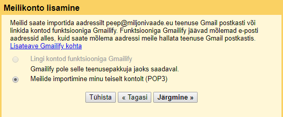 Valikuline: Kui soovid kirju Gmail’i keskkonnas ka saata, siis vali järgmises aknas Jah, ma tahan, et mul oleks võimalik meile saata kui ja klõpsa nupule Järgmine >>