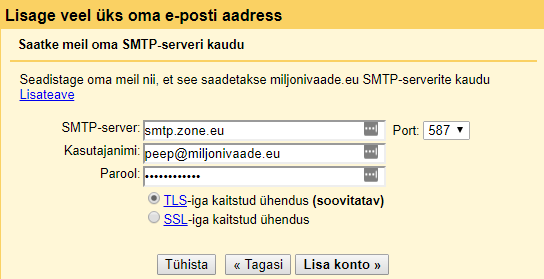 - Väljamineva e-posti ehk SMTP server: smtp.zone.eu port 465 või 587
