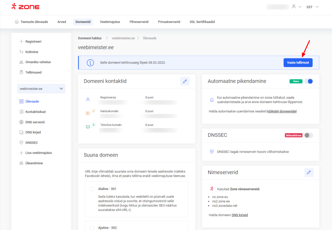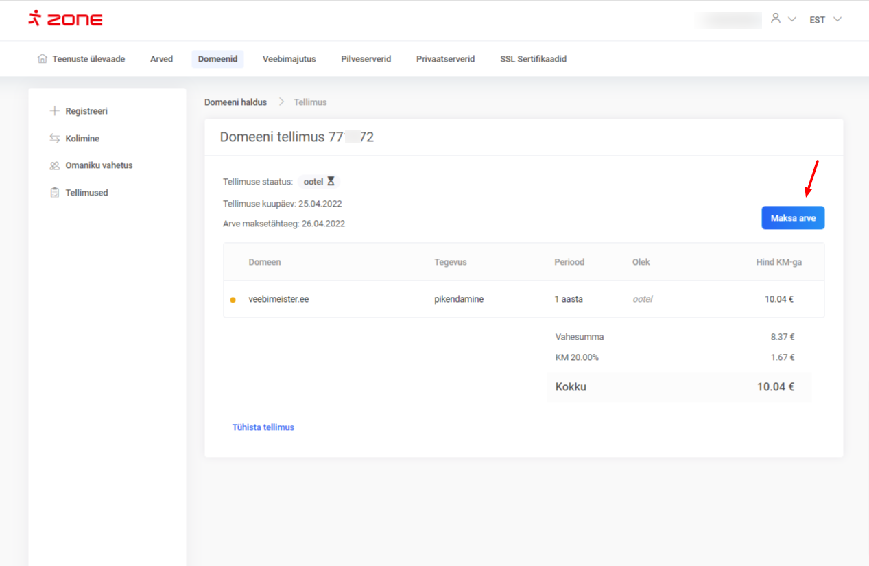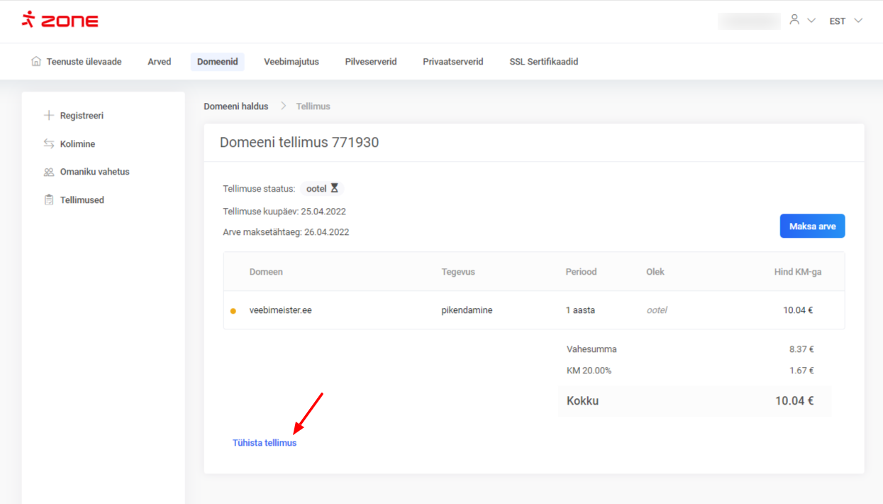 Sellisel juhul saad domeeni pikendamise tellimuse tühistada domeenide ülevaate aknast, klõpsates nupul “Vaata tellimust”
