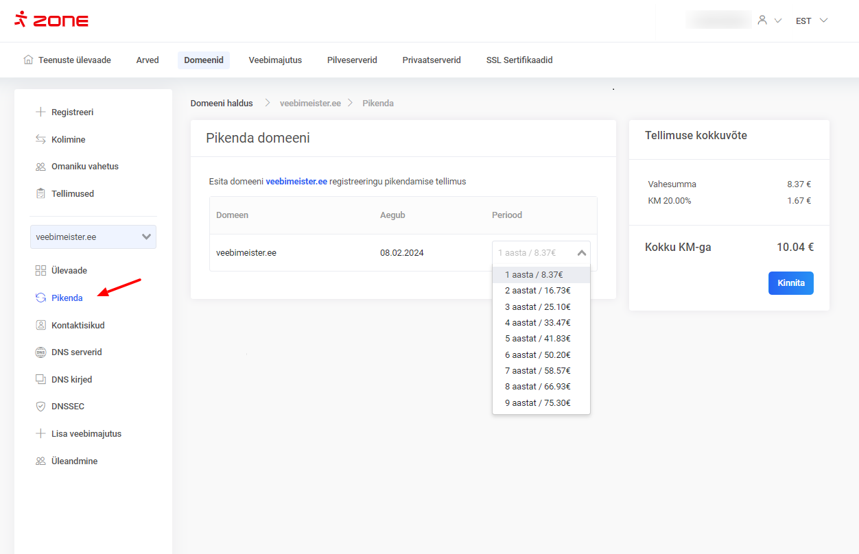 Domeeni saad pikendada ka enne meiepoolse tellimuse koostamist, selleks logi sisse “Minu Zone” keskkonda ja klõpsa “Teenuste ülevaate” esilehel domeeni nimel.