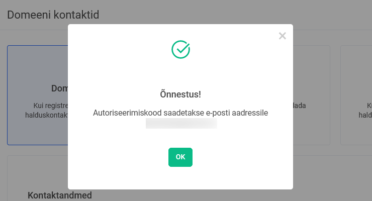 Autoriseerimiskood saadetakse 10-15 minuti jooksul domeeni omaniku kontakt e-posti aadressile.