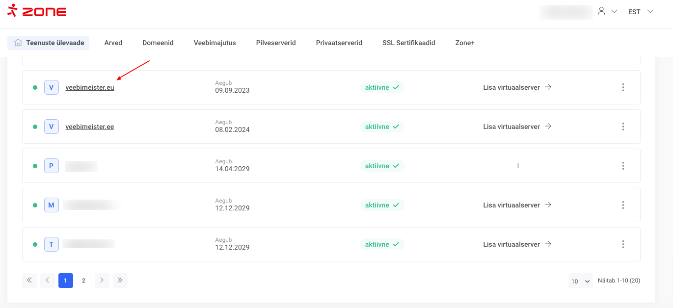 Domeeni autoriseerimiskoodi tellimiseks klõpsa “Minu Zone” keskkonna Teenuste ülevaate lehel soovitud domeeni nimel.
