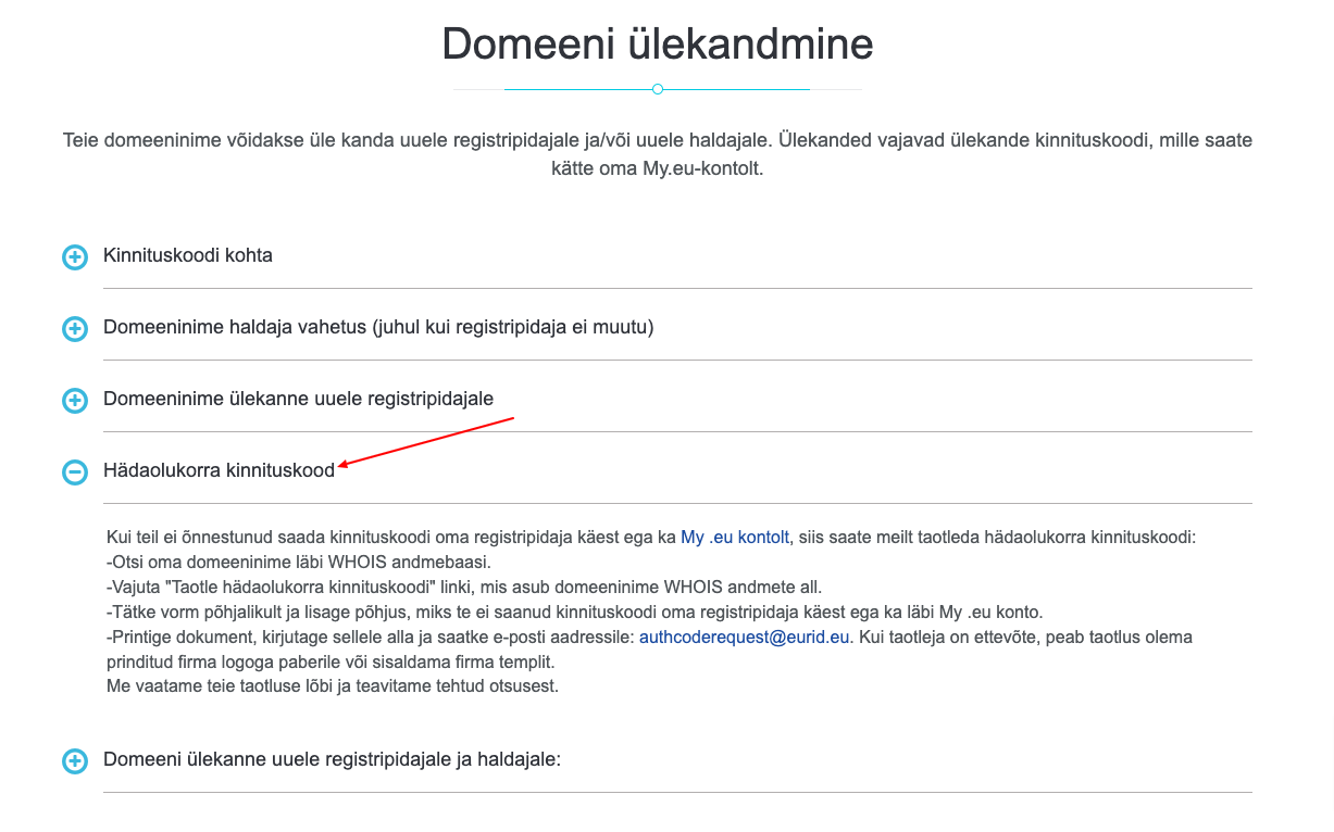 Kui Teil ei ole võimalik autoriseerimiskoodi läbi kahe eelneva meetodi tellida, siis saate saata EURid-ile ametliku hädaolukorra kinnituskoodi taotluse. Sealt leiate ka juhised vormi täitmiseks (jaotus “Hädaolukorra kinnituskood”): https://eurid.eu/et/minu/