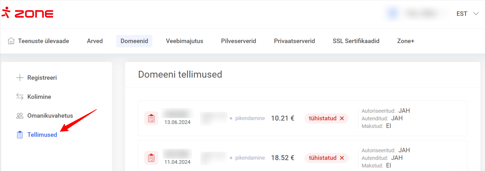 Domeeni ületoomine on tasuline, täpsema info leiab hinnakirjast. Arve koostatakse tellimuse käigus. Tellimus võetakse menetlusse kui arve on tasutud ning summa on laekunud Zone süsteemi. Juba esitatud tellimust ja koostatud arvet kuvatakse domeenide halduse valikus Tellimused.