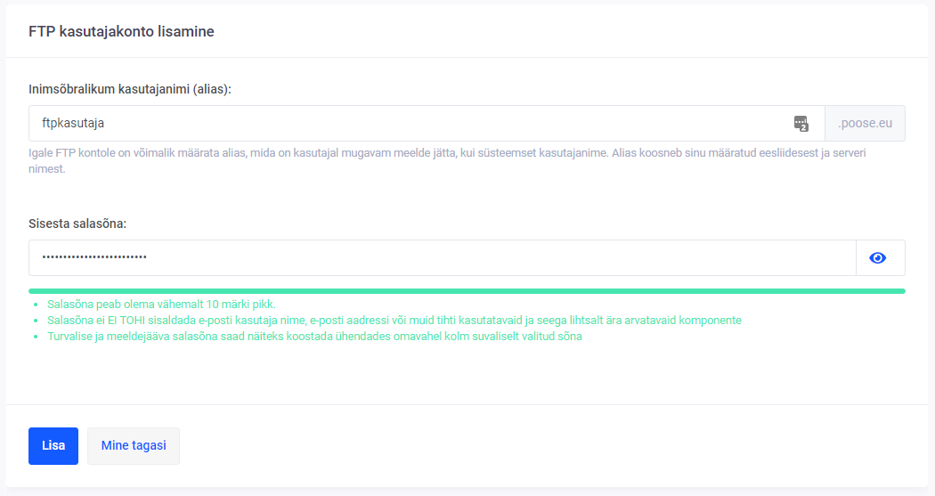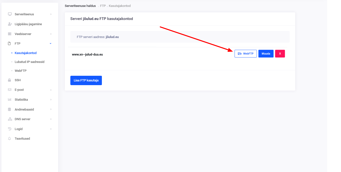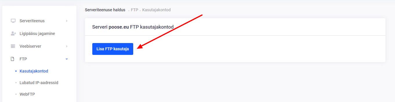 Uue konto lisamiseks vajuta nupule lisa FTP kasutaja: