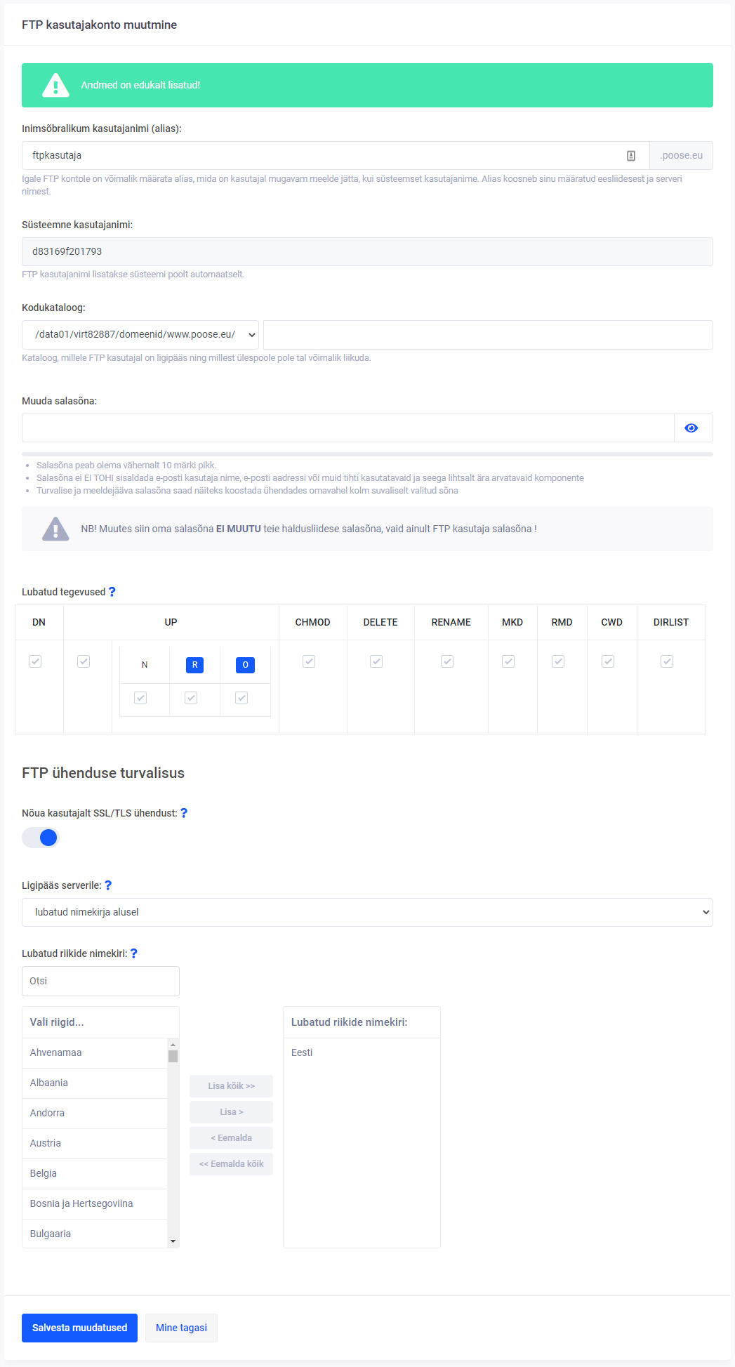 Peale konto edukat lisamist on sul võimalik juba peenhäälestada FTP konto seadeid. Sealjuures piirata ligipääsu riigipõhiselt, keelata ebaturvalised ühendused ja FTP kasutaja ligipääsu kataloog.