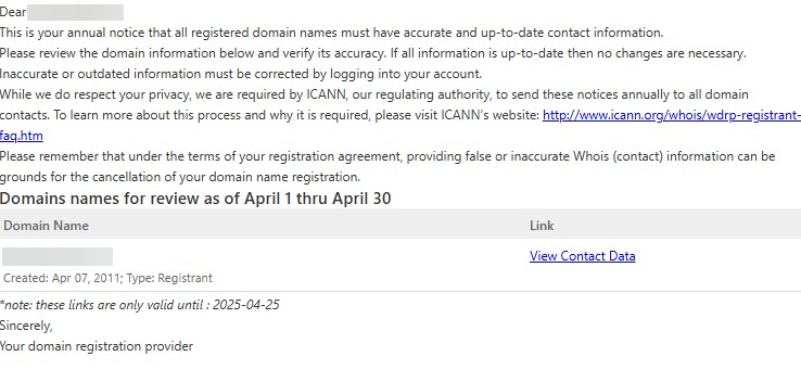 Kord aastas saadame meeldetuletuse, et domeeni registreerija saaks üle vaadata ja vajadusel uuendada oma domeeniga seotud kontaktandmed. Kui andmed on ajakohased, ei ole vaja midagi muuta.