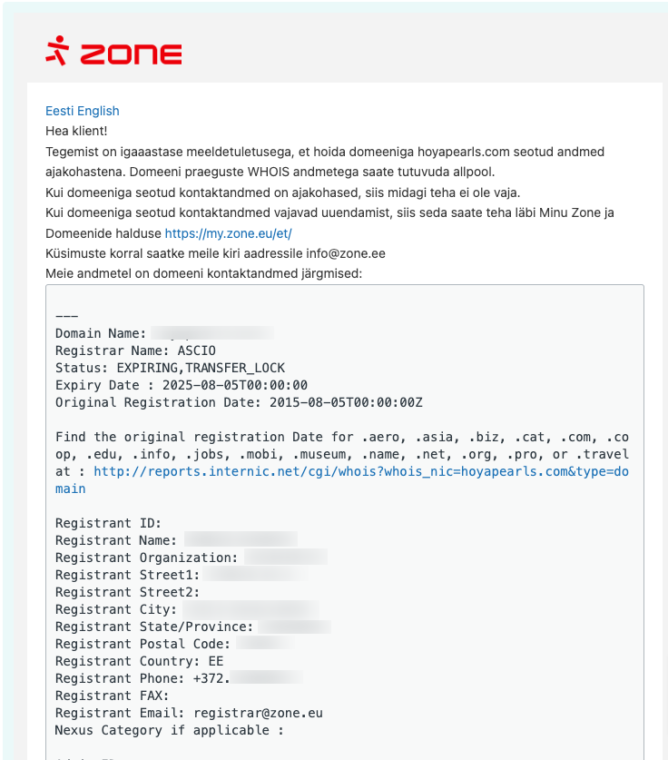 Kui teenusepakkujaks on Ascio Technologies, saadetakse meeldetuletus aadressilt registrar@postman.zone.eu ja see näeb välja nii: