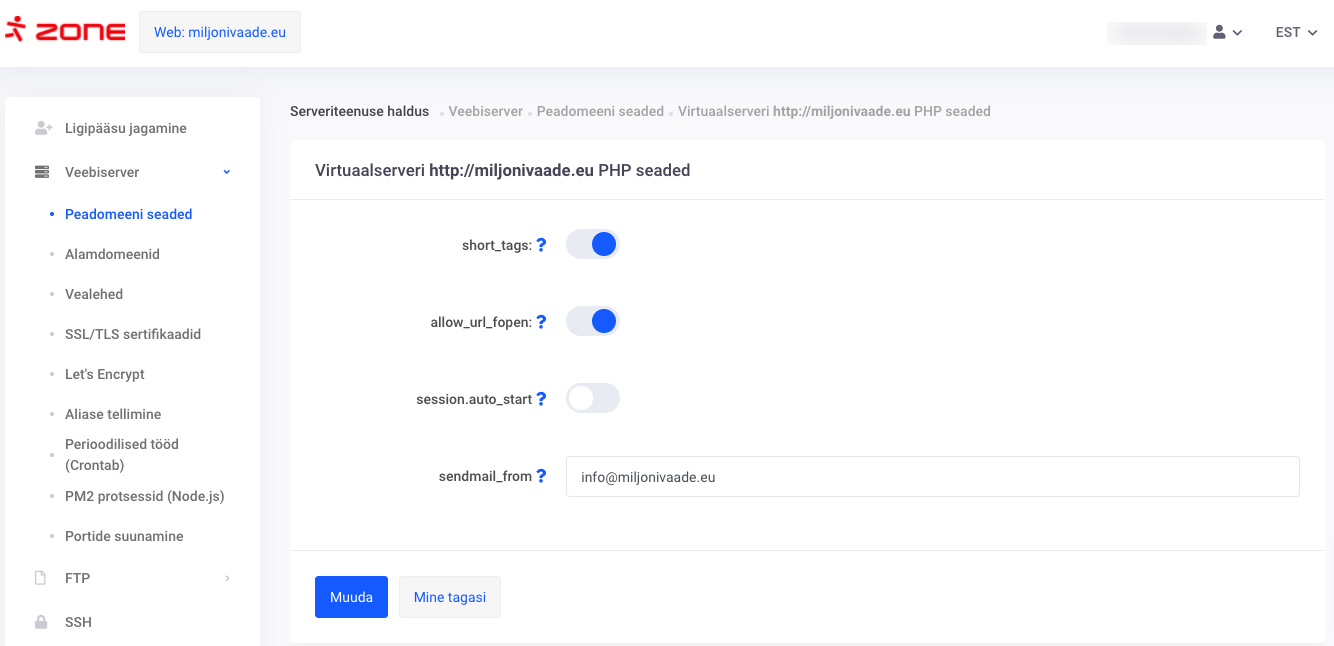 Avanevas aknas tuleb muuta sendmail_from väärtust. Sinna tuleb sisestada ainult e-posti aadress kujul aadress@domeeninimi.ee.
