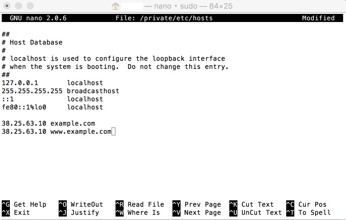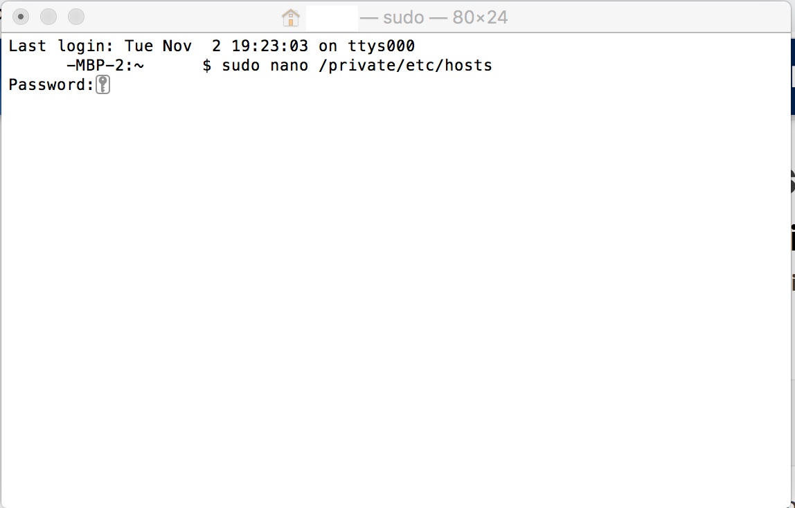 sudo nano /private/etc/hostsja arvuti peakasutaja salasõna ning vajutaEnter.