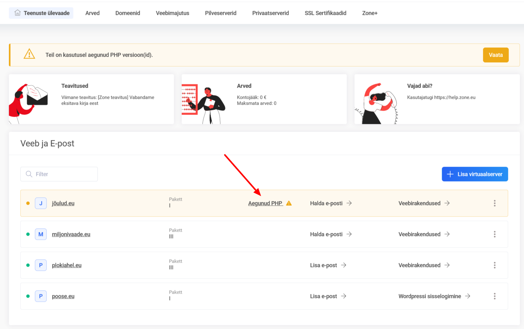 Kui mõnes sinu virtuaalserveris on kasutusel aegunud PHP versioone, tekib selle kohta vastav hoiatus Minu Zone keskkonnas teenuste ülevaate lehele.