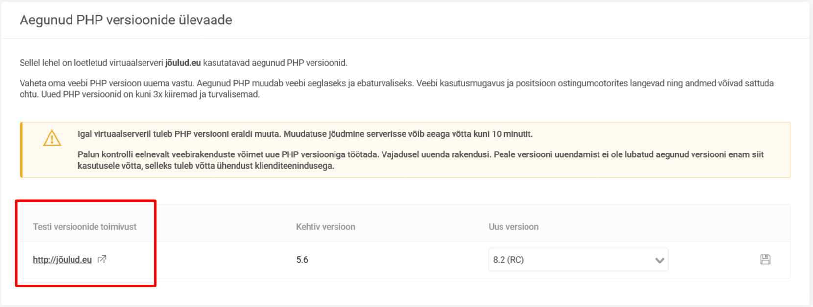 Kuna PHP versioonivahetus võib tekitada veebilehele veateateid ja versiooni vahetus võtab kuni 3 minutit, siis on soovitatav enne muudatust lehe toimivust testida.
