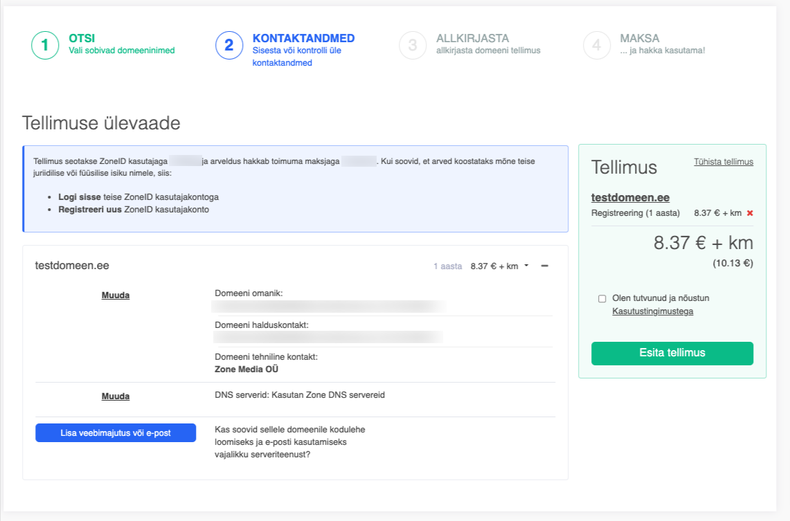 Kui nii domeeni registreerija kui ka arve saaja on õiged ja sobivad, siis tuleb tutvuda ja nõustuda Kasutajatingimustega ning esitada tellimus.