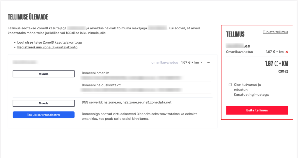 Tellimuse ülevaates korratakse üle, millise ZoneID kasutajaga tellimus seotakse ja kellele on koostatud arve. Selles etapis saab siseneda teise ZoneID kontoga või vajaliku konto puudumisel luua uue ZoneID konto. Samuti kuvatakse nii domeeni uue omaniku kui ka halduskontakti andmed ning neid on veel ka võimalik muuta.