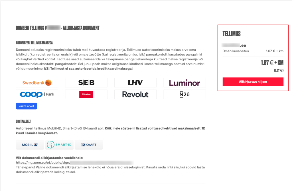 Kui tellimus on esitatud, siis saab domeeni uus omanik taotluse allkirjastada kas digitaalselt või maksega autoriseerides.