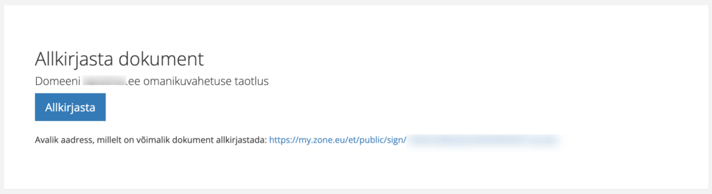 Kui klõpsata Allkirjasta nupule. Jägmisel lehel saab salvestada taotluse allkirjastamise lingi ja edastada selle vajadusel ise senisele omanikule allkirjastamiseks. Samuti saab sellel lehel alla laadida taotluse, et edastada see senisele omanikule eraldi allkirjastamiseks. Sel juhul tuleb allkirjastatud taotlus saata meile info@zone.ee aadressile.