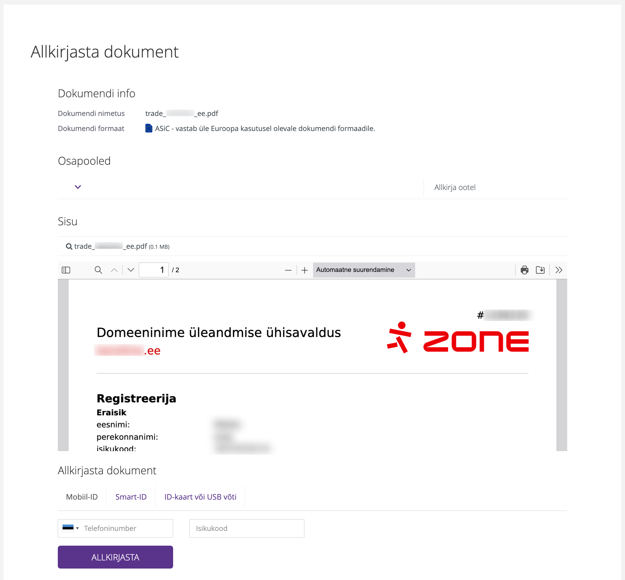 Kui tellimus on esitatud, siis saadetakse nii tellimuse esitanud ZoneID konto kontaktaadressile kui ka domeeni senisele omanikule domeeni kontaktiks olevale e-posti aadressile kiri, milles oleva lingi kaudu saavad mõlemad osapooled taotluse digitaalselt allkirjastada.