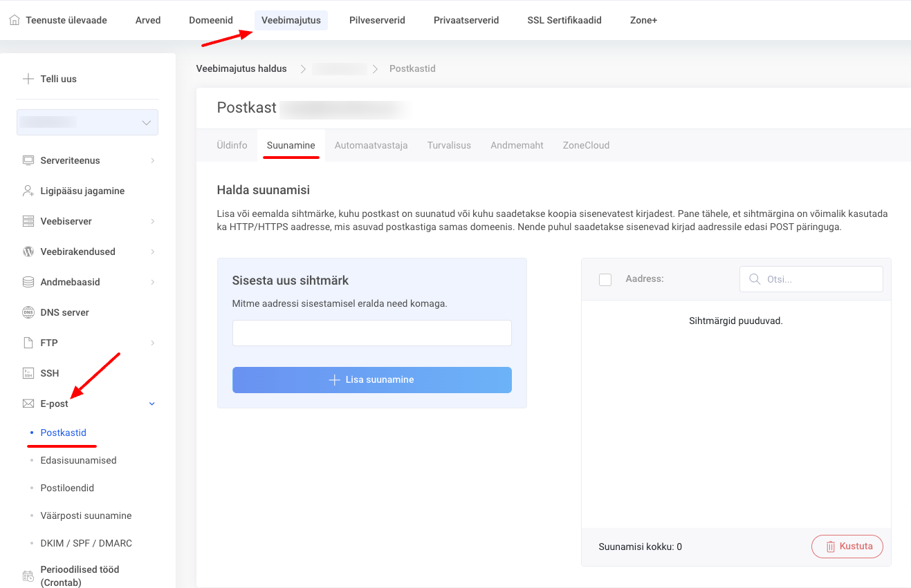 Mail-to-http suunamise URL’ile saab lisada Minu Zone keskkonnas veebimajutuse jaotises E-post -> Postkastid vastava postkasti halduse jaotises Suunamine.