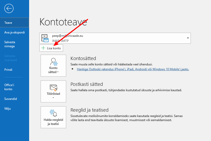 1. Uue e-posti konto lisamiseks vali Outlooki menüüs Fail ja sealt alt Lisa konto.