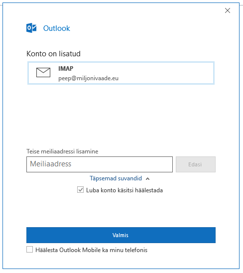 2. Avanevas aknas sisesta oma e-posti konto aadress, mida Outlooki seadistama hakkad. Lisaks vali Täpsemad suvandid ja märgi linnuke valiku ette Luba konto käsitsi häälestada. Peale seda klõpsa nupule Loo ühendus.