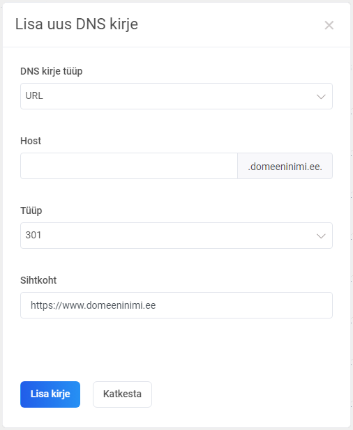 ning selleks, et teise astme domeeni kaudu jõutaks ka teenusepakkuja poolt antud domeenile, lisa URL kirje: