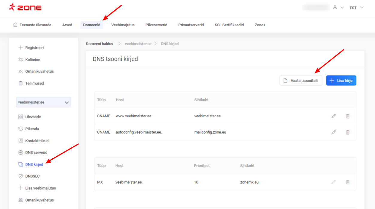 Kui kasutad veebimajutuse teenust mujal, kuid domeen on Zone registris ja kasutab Zone nimeservereid, on DNS tsoonifail leitav domeeni halduses DNS kirjed jaotises: