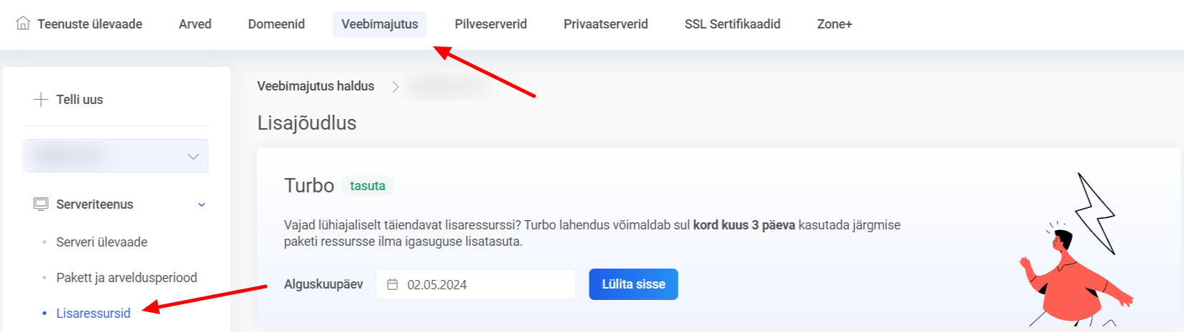 Turbo nupu leidmiseks tuleb esmalt sisse logida teenuste halduskeskkonda Minu Zone. Avanevalt lehelt vali ülevalt menüüst Veebimajutus. Kui kontol on rohkem kui üks serveriteenuse pakett, ava soovitud serveriteenuse haldus ning seejärel vali Serveriteenus alt Lisaressursid.