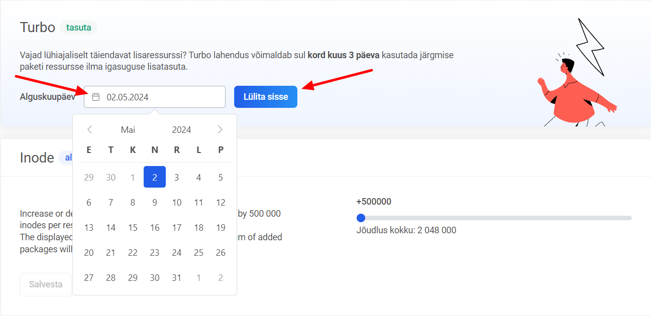 Turbo nupu aktiveerimiseks vali esmalt kuupäev, millal lisaressursse tarvis on ning seejärel vajuta nupule Lülita sisse.
