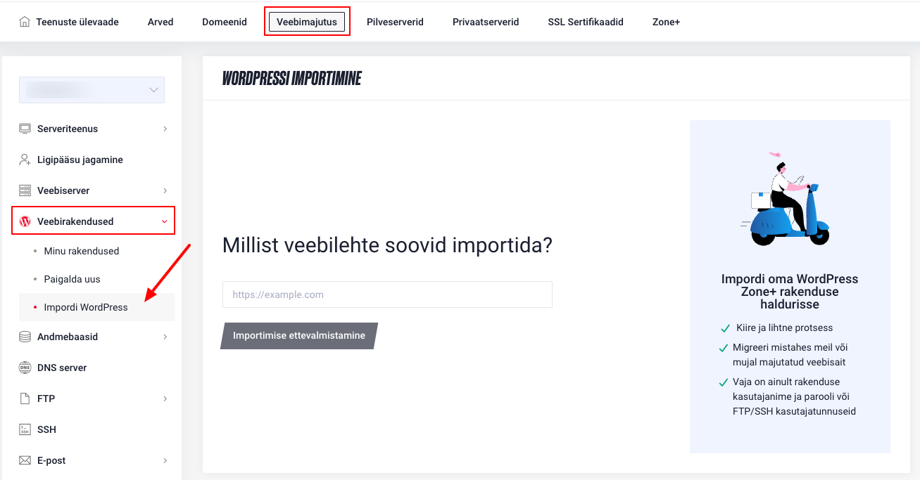 WordPressi rakendust on võimalik importida Minu Zone keskkonnas, valides ülevaatelehel