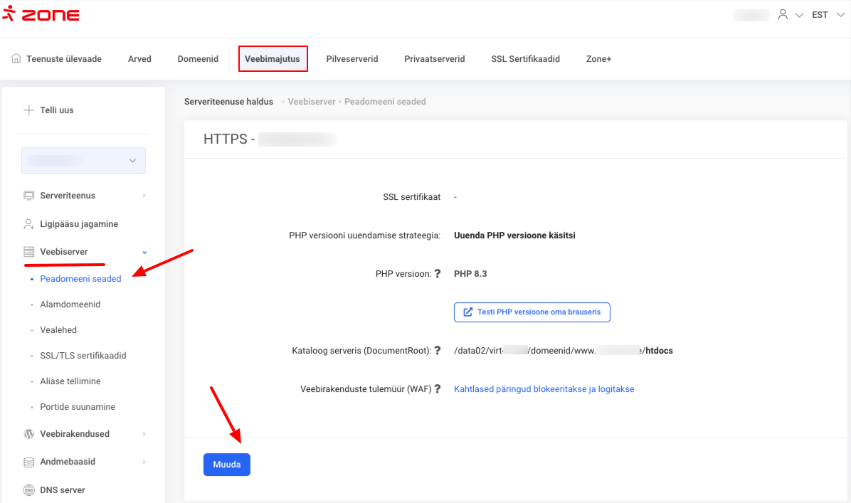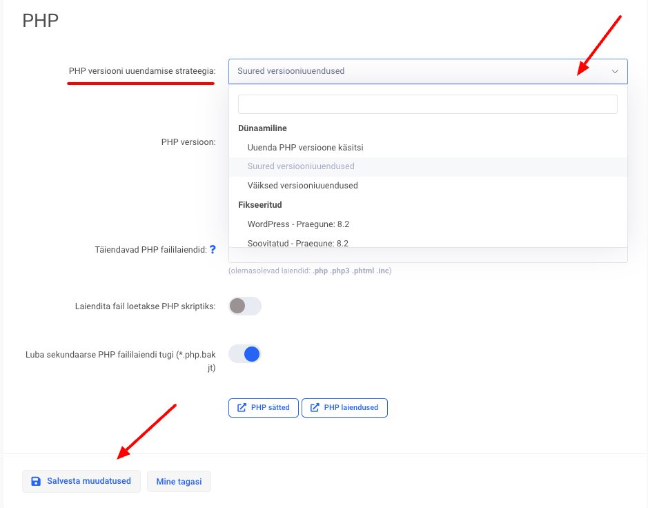 Jaotises PHP vali PHP versiooni uuendamise strateegia ja kui oled valiku teinud, siis salvestamiseks klõpsa Salvesta muudatused.