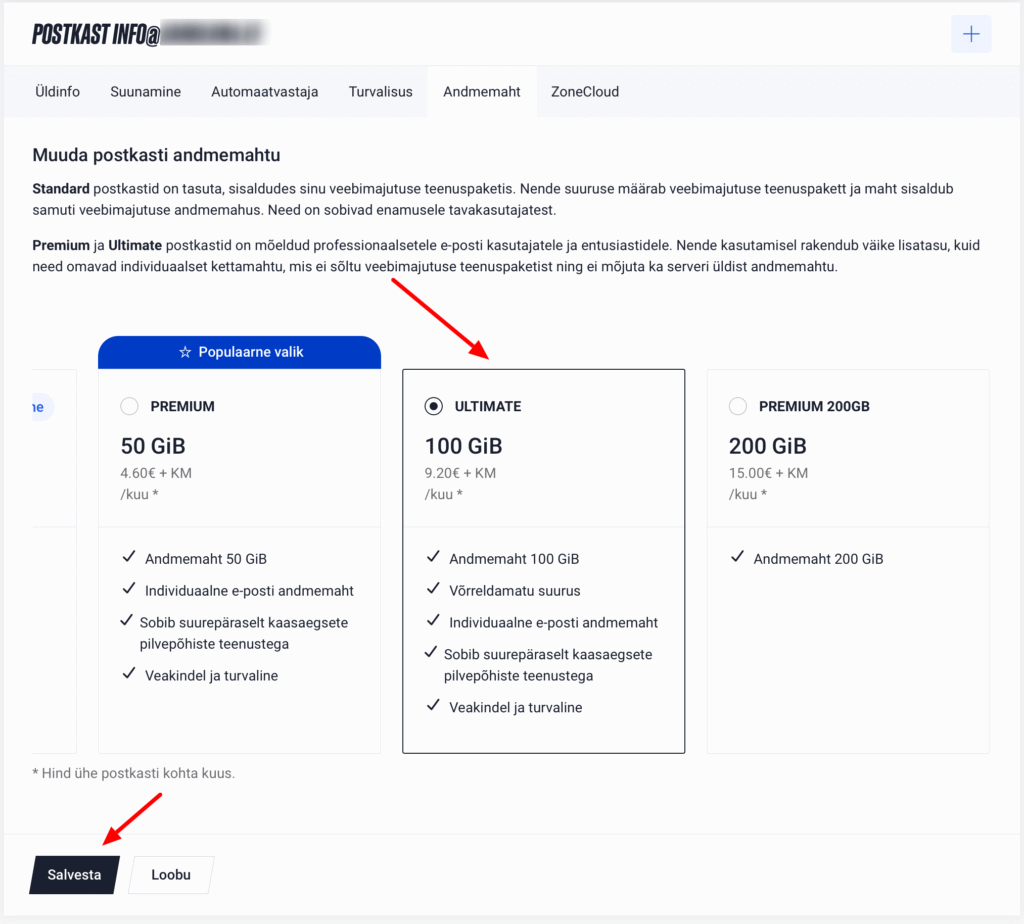 Vali pakettide juurest sobiv ja vajuta Salvesta. Paketile vastavad ressursid rakenduvad koheselt peale muudatuste salvestamist.