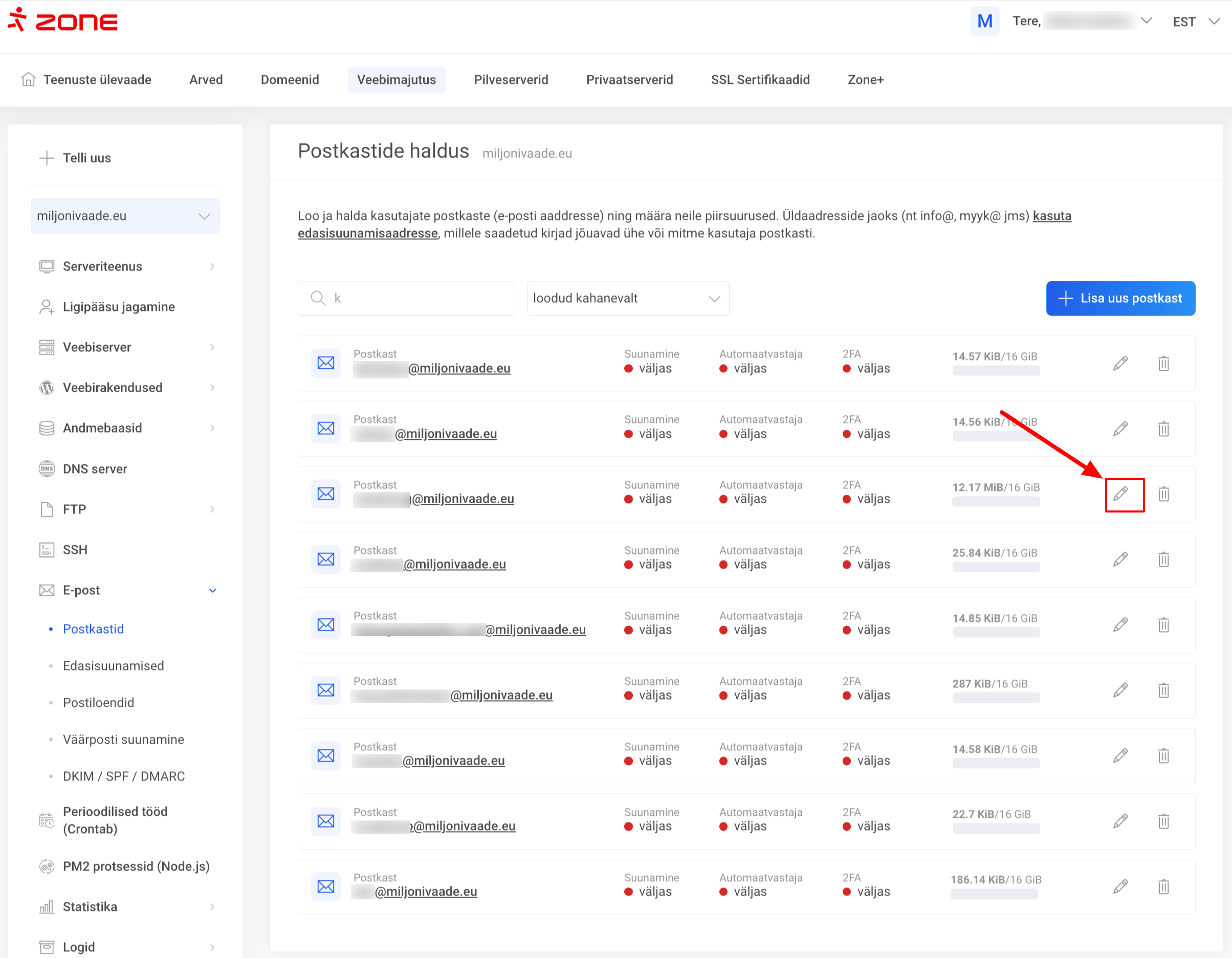 Nüüd avaneb E-post alt menüü Postkastid ja seal vajuta pliiatsi ikoonile selle konto juurest, mis suurendamist vajab.