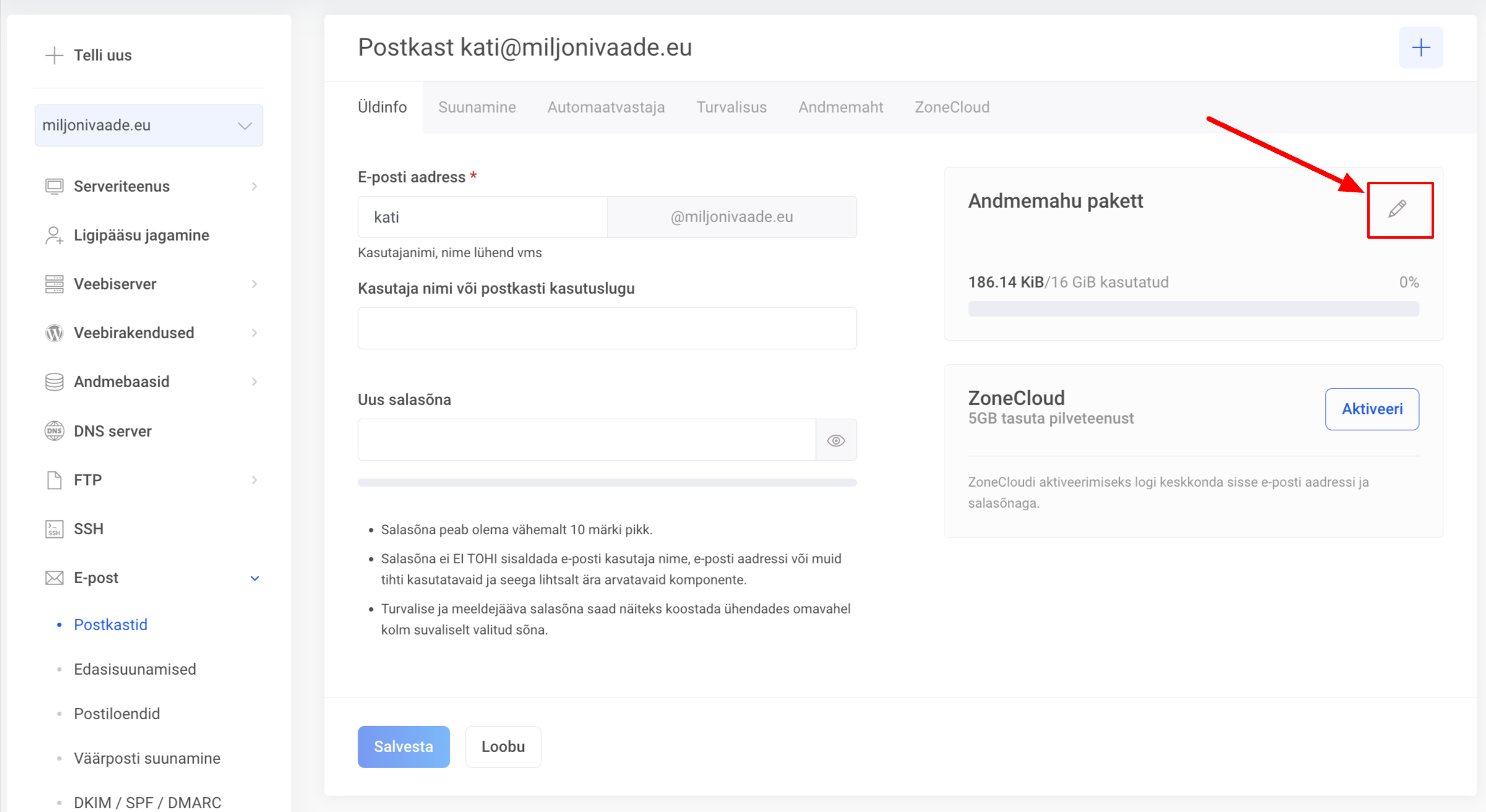E-posti konto piirmahtu saab muuta Minu Zone keskkonnas valides teenuste ülevaatelehel Veeb ja E-post jaotises E-post.