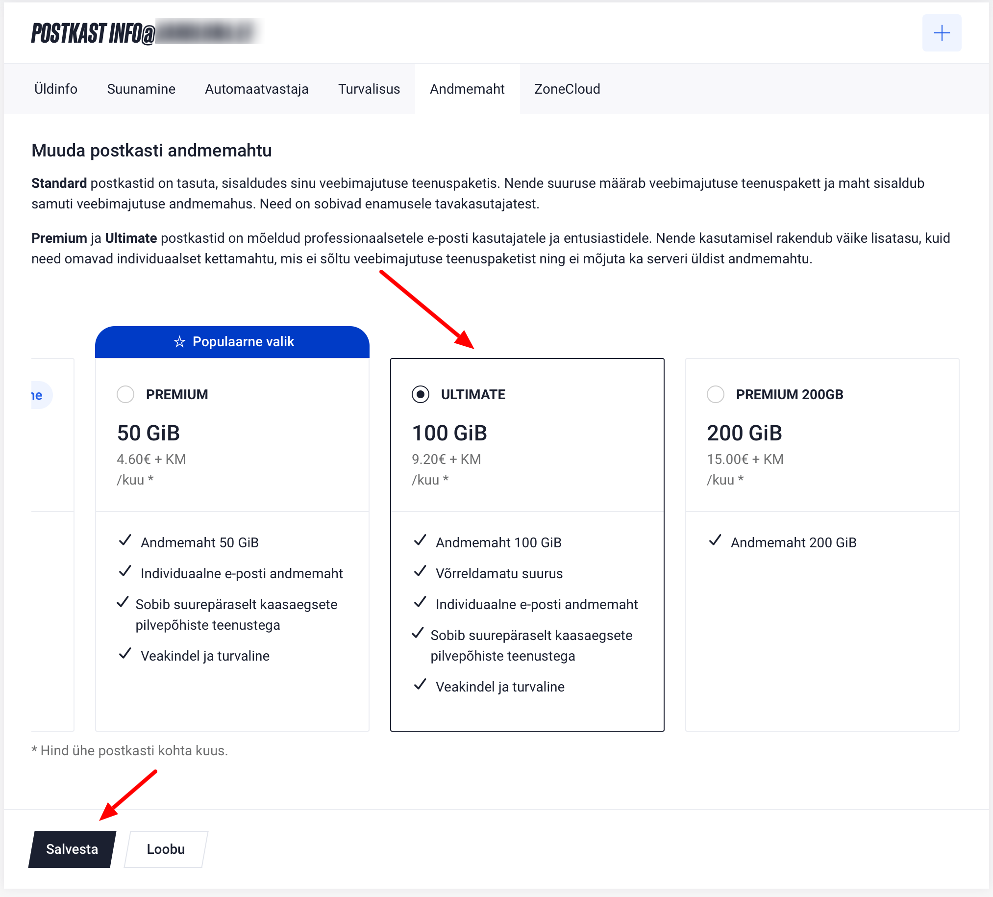 Vali pakettide juurest sobiv ja vajuta Salvesta. Paketile vastavad ressursid rakenduvad koheselt peale muudatuste salvestamist.