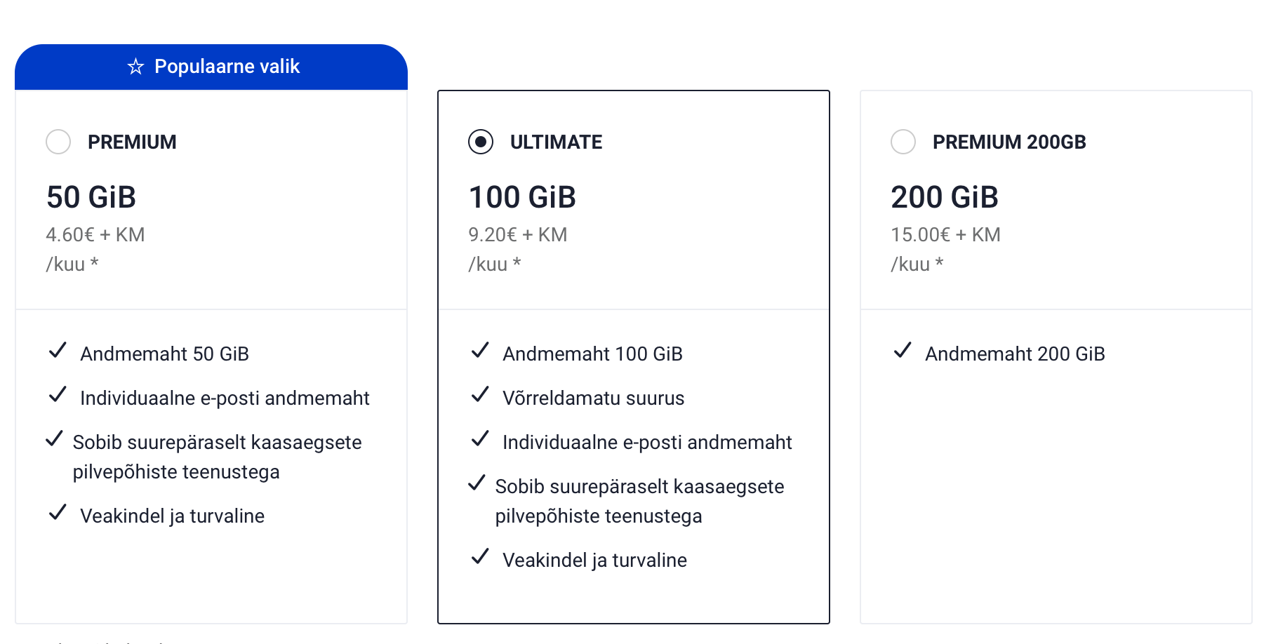 * Hind on aastase arveldusperioodi puhul soodsam ehk Premium 41.40€/+KM, Ultimate 82.80€/+KM ja Premium 200GB 156.00€/+KM aastas.