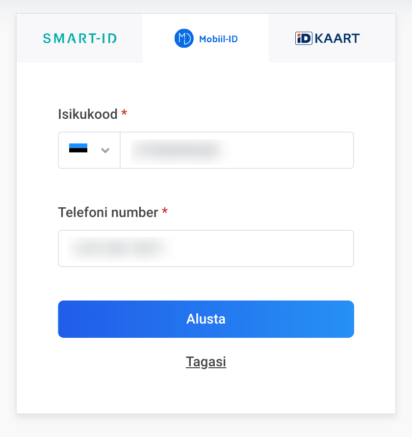 Järgmiseks vali Mobiil-ID, sisesta isikukood ja telefoninumber ning vajuta Alusta.