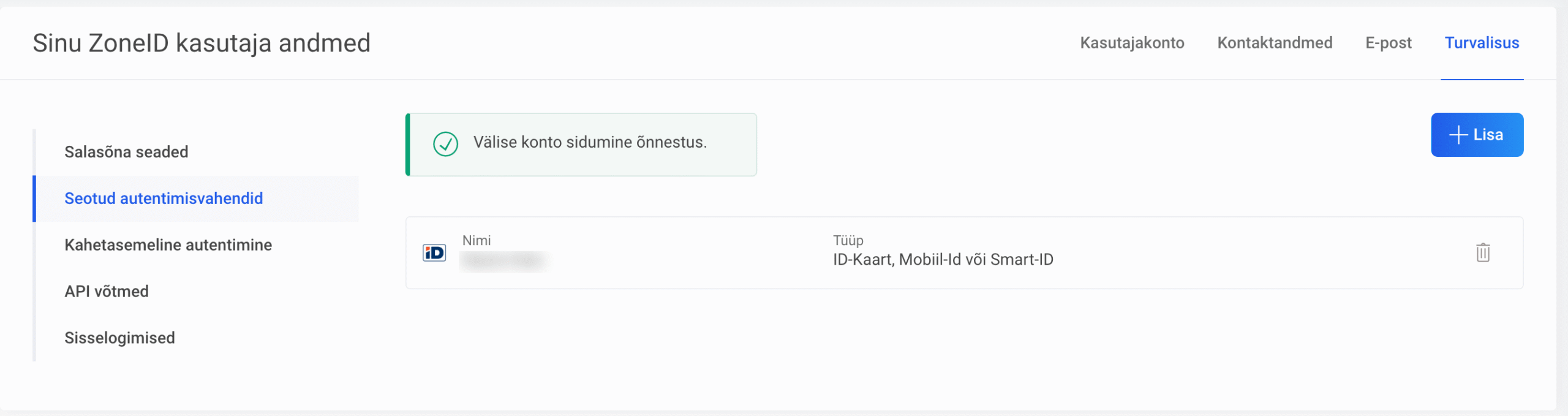 Identiteet seotakse kontoga ja lisatakse seotud identiteetide nimekirja.