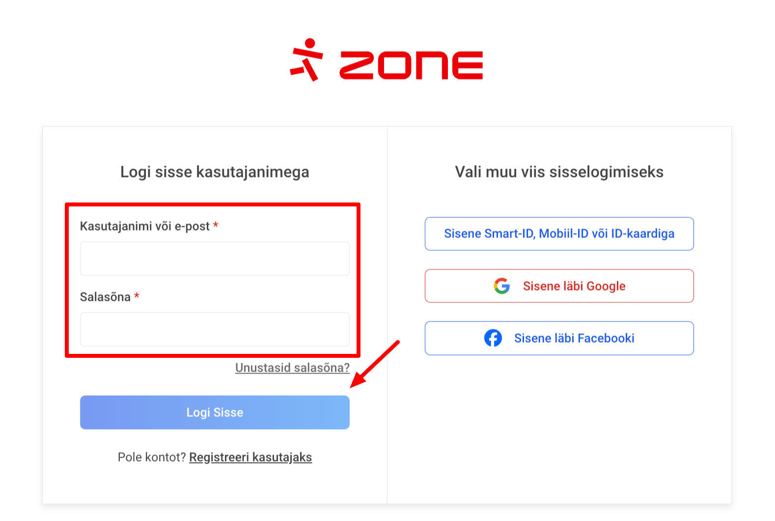 Sisesta ZoneID konto kasutajanimi ja salasõna ning vajuta nupule Logi sisse.