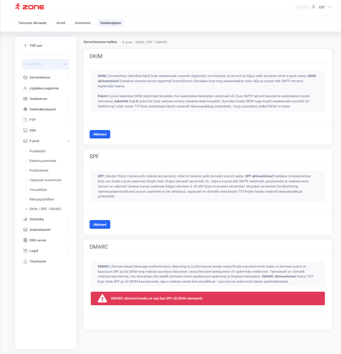 SPF kirje saab aktiveerida Minu Zone keskkonnas Veebimajutuse jaotises E-post -> DKIM / SPF / DMARC.