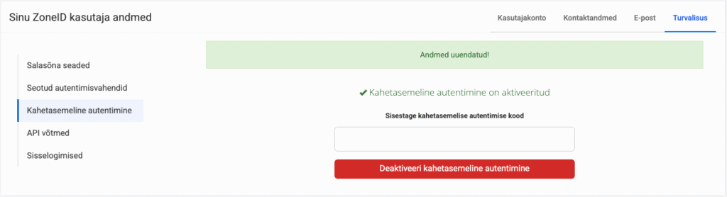 Peale edukat koodi sisestamist kuvatakse teade Kahetasemeline autentimine on aktiveeritud. Samast menüüst on hiljem võimalik vajadusel ka 2FA välja lülitada.