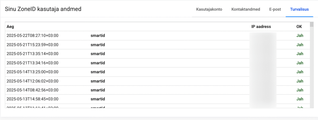 Turvalisus jaotises leiab Sisselogimised alt ZoneID kontole sisselogimiste logi. Logi kuvatakse viimase aasta kohta koos õnnestunud ja ebaõnnestunud sisselogimiskatsetega, lisatud on ka katsetuse IP-aadress.