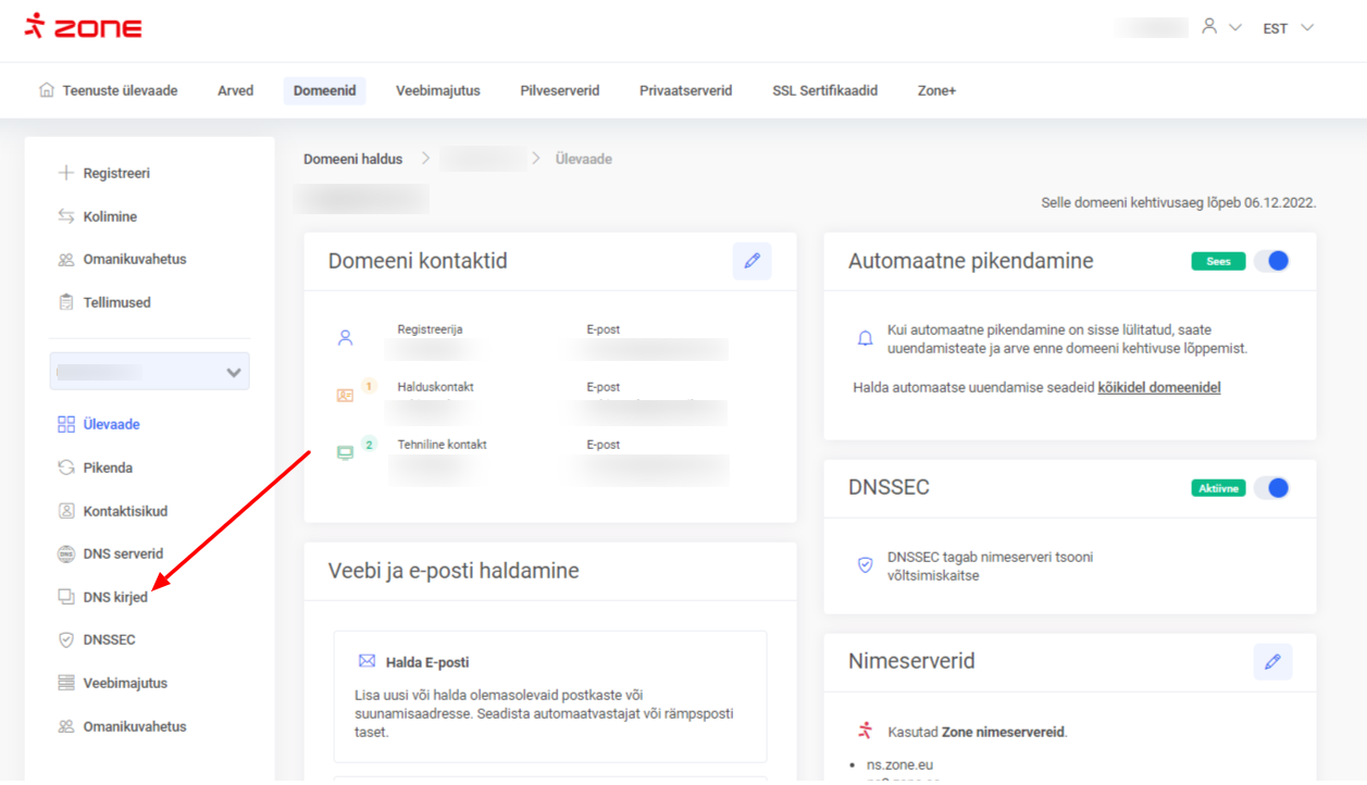 Seejärel klõpsa vasakult menüüst DNS kirjed.