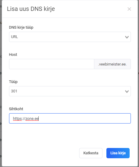 Kui soovid lisada www. alamdomeeni suunamist, siis tuleb Host lahtrisse sisestada www. Soovitav on lisada alati kaks kirjet: koos www-ga ja ilma www-ta (sel juhul jäta Host lahter tühjaks).