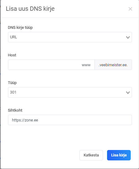 - Tehniliselt ei ole nimeserveris URL kirjet olemas. Taustal lisatakse Nimeserveri tsooni A kirje IP aadressile
