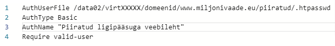 AuthUserFile /path/to/.htpasswd AuthType Basic AuthName "Piiratud ligipääsuga veebileht" Require valid-user