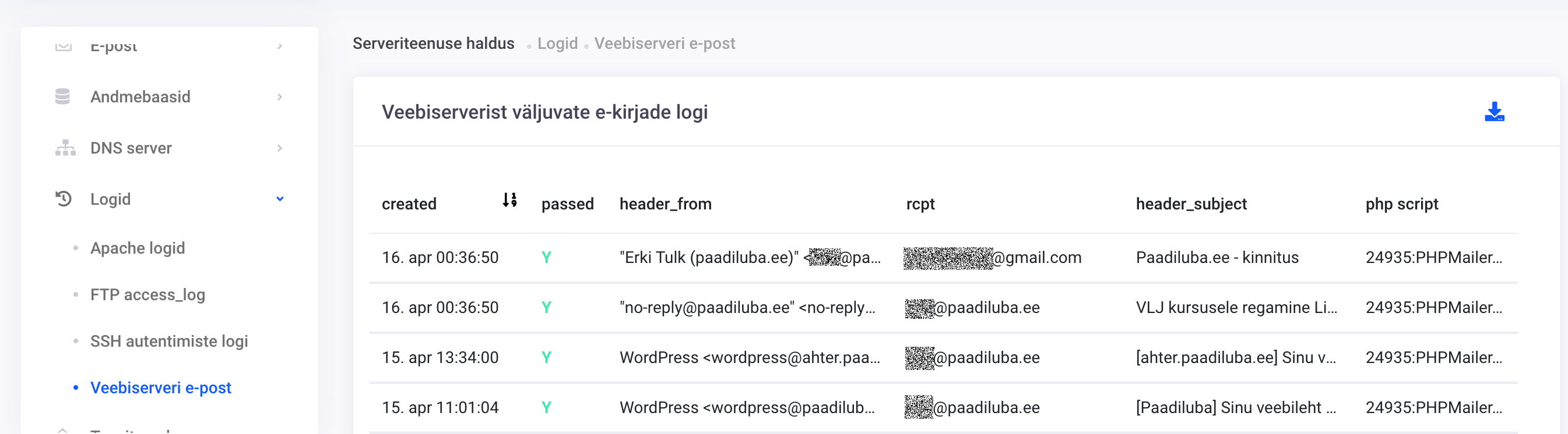 passed– kas kiri läbis filtri (N viitab mahupiirajale või spämmi tuvastamisele)header_from– saatja aadress (envelope_from nähtav .json versioonis)rcpt– tegelik adressaat (kuvab ka bcc: aadresse; header_to nähtav .json versioonis)php script– kirja saatmiseks kasutatud skript (ainult PHP mail() kasutamisel – võib olla puudu, kui saatmiseks kasutatakse seda asendavat teeki)