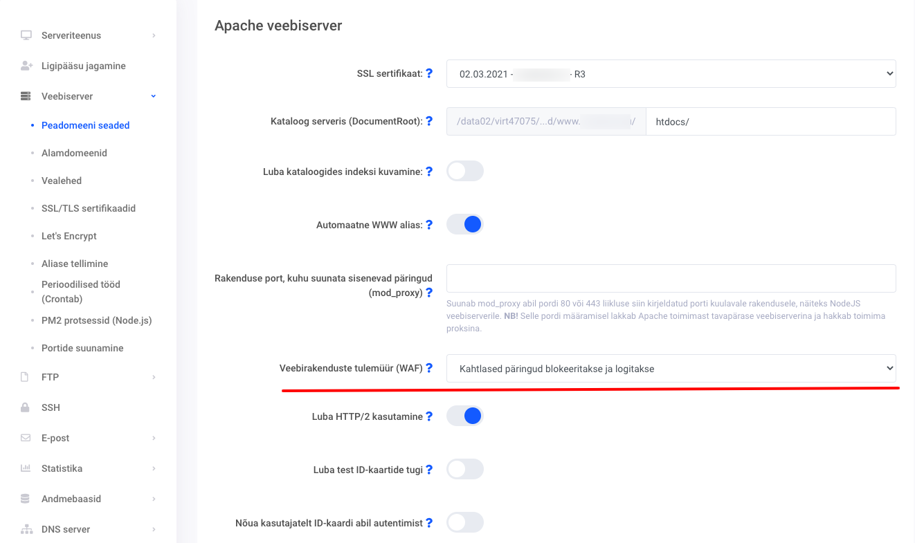 Kui soovid muuta alamdomeeni WAF’i seadeid, vali jaotus Alamdomeenid